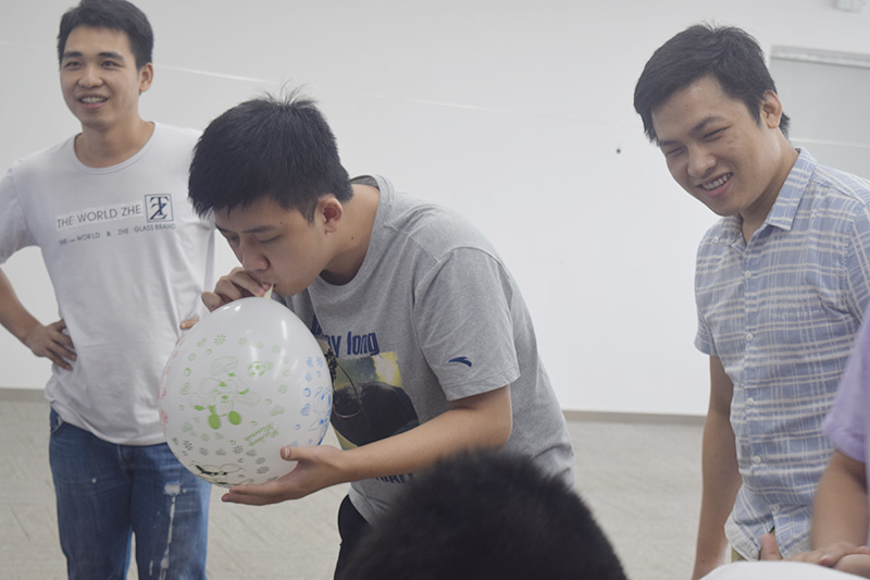 關(guān),氣球爆破。看誰氣足,氣球破的快,很明顯紅隊(duì)是領(lǐng)先的一組。但藍(lán)隊(duì)后來居上,領(lǐng)先獲得關(guān)的勝利。