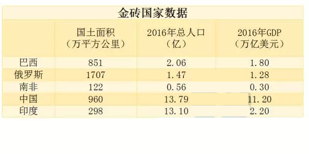 ? 金磚國家由中國、巴西、俄羅斯、印度和巴西5國組成,分布在亞洲、非洲、歐洲和美洲,是當(dāng)前全球主要的新興經(jīng)濟(jì)體。5國國土面積占世界領(lǐng)土面積的26.46%,人口數(shù)量占世界人口數(shù)量的42.58%,2016年GDP總量占全球的22.29%左右。