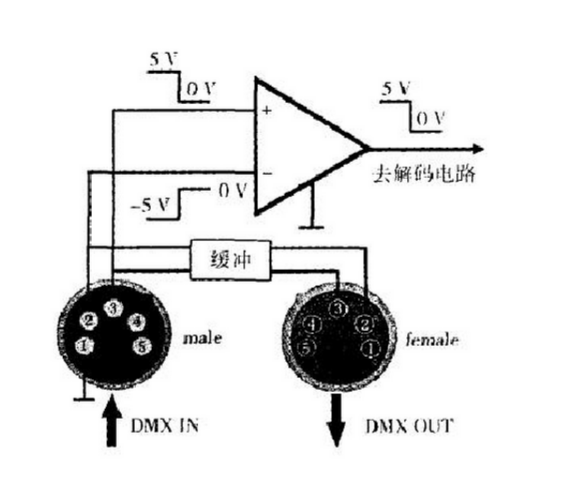 DMX512標(biāo)準(zhǔn)規(guī)定DMX接口用5芯卡依口,其中1芯接地,2,3和4,5芯傳輸控制信號(2,4為反相端,3,5為同相端),4,5芯原打算傳輸燈光設(shè)備的狀態(tài)及錯(cuò)誤檢測等信息,后來閑置不用。之所以要求用5芯卡依口而不是更為常見的3芯卡依口,是為了防止不小心和專業(yè)音響上常用的3芯卡依口產(chǎn)生誤連接,因?yàn)橐繇懺O(shè)備上連接電容話筒的3芯卡依口可對外提供48 v的幻像電壓,這種錯(cuò)誤連接,極易燒壞內(nèi)部電路。盡管如此,很多電腦燈還是采用了3芯卡依口,如出現(xiàn)兩種卡儂口并存的情況,要用轉(zhuǎn)接器予以正確轉(zhuǎn)接。