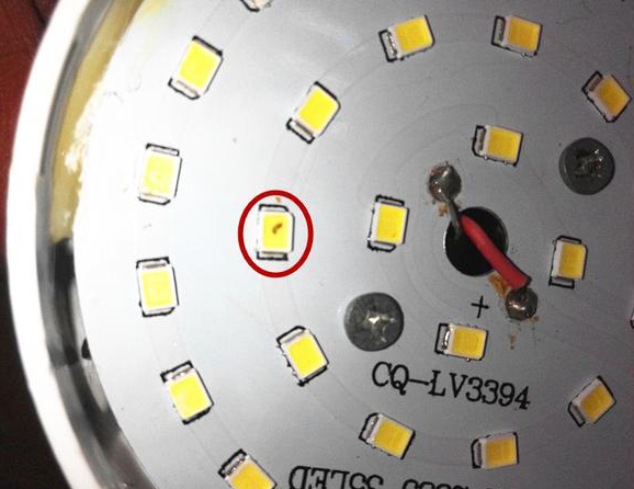 燒毀的燈珠和正常燈珠從外觀上是可以看出來的,燒毀的燈珠在中間的位置有一個黑色的圓點,而且這個圓點是擦不掉的。